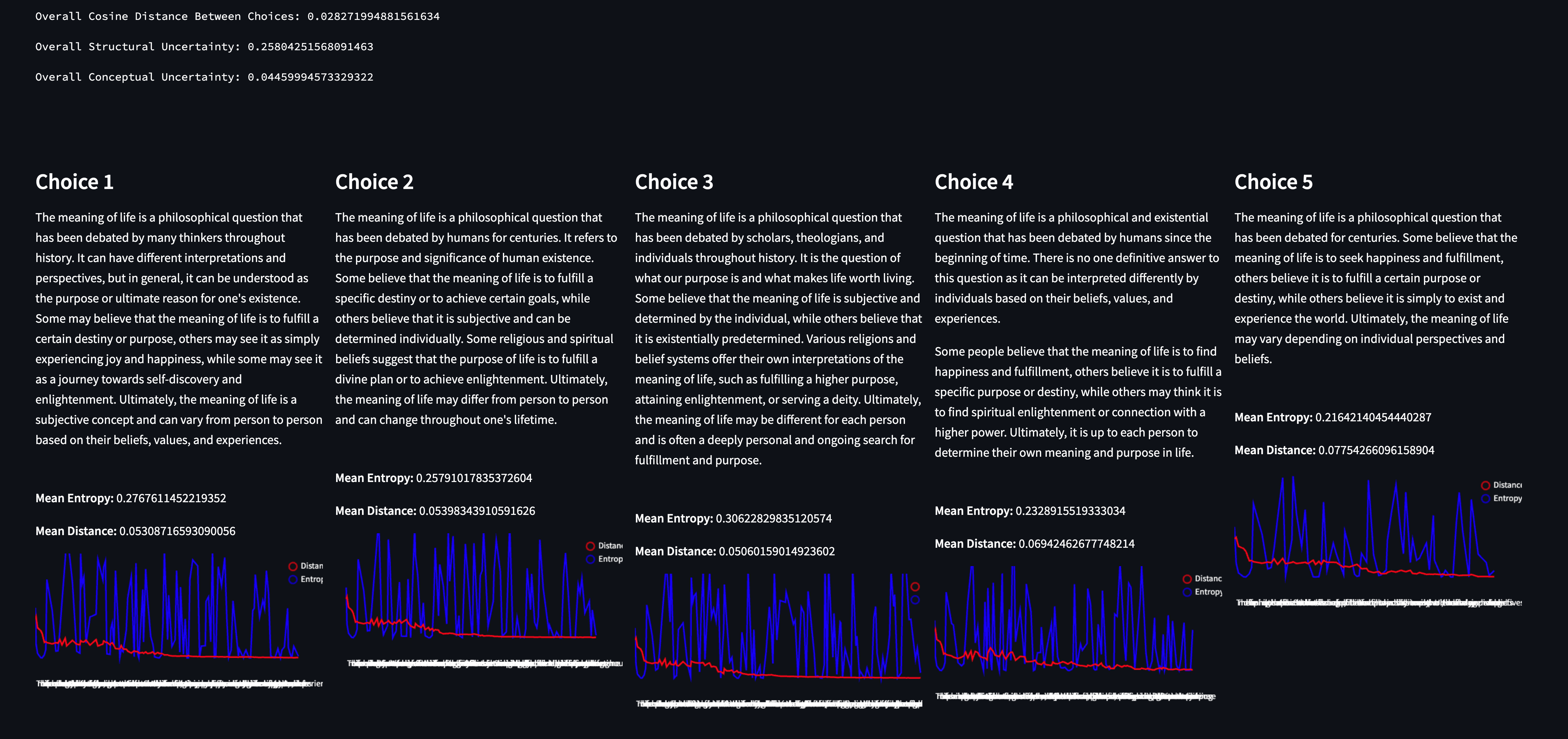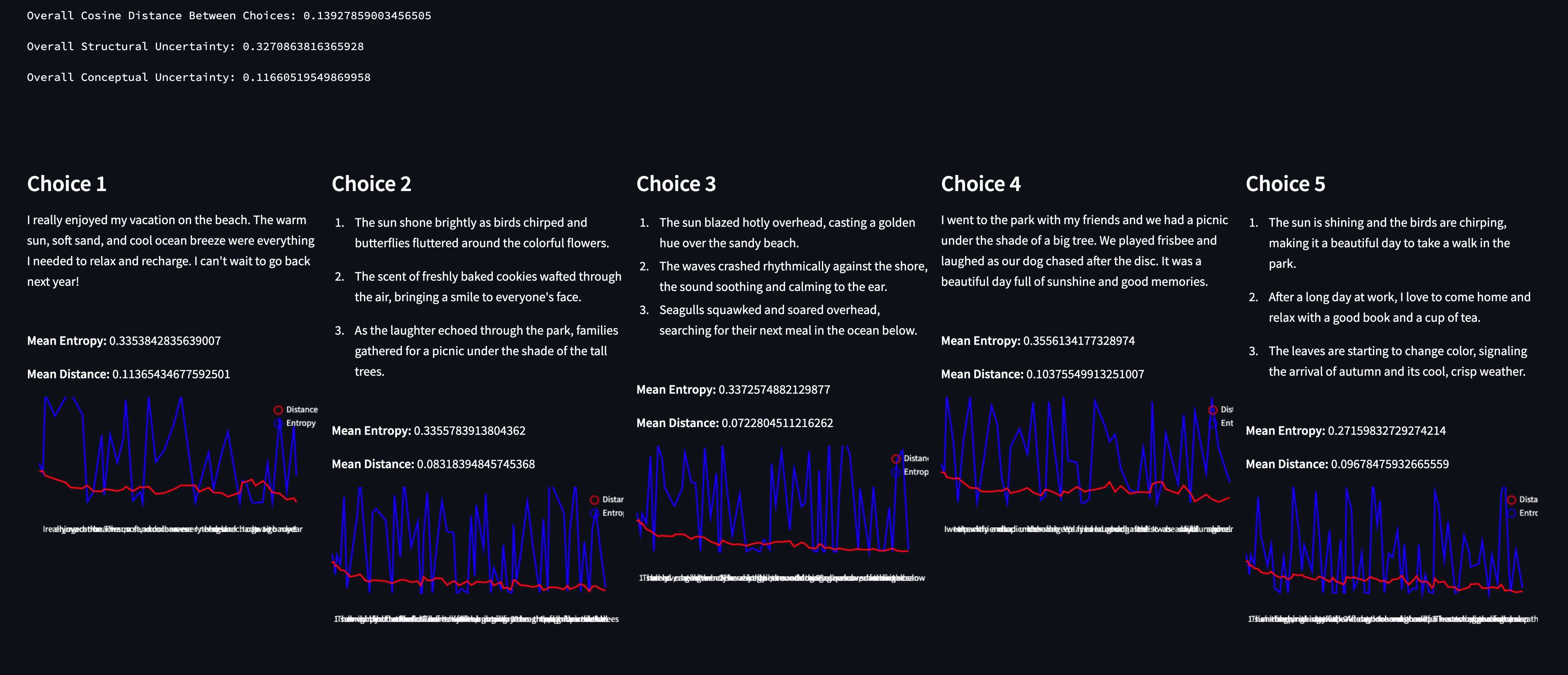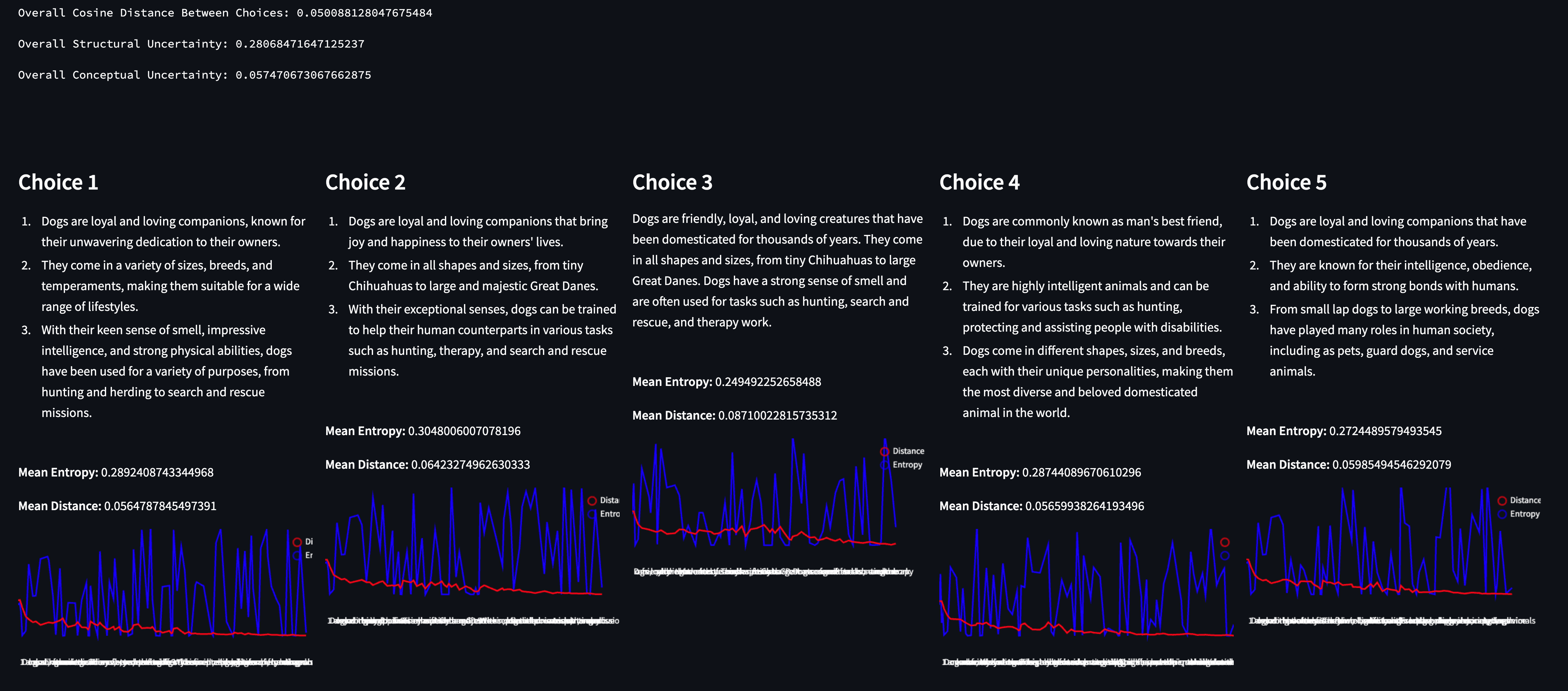 By quickly scanning the choices, we can see that the model was consistent in what it was trying to say - and the metrics reflect this. The Conceptual Uncertainty is extremely low, as is the cosine distance between each choice. However, structural uncertainty is curiously (relatively) high.