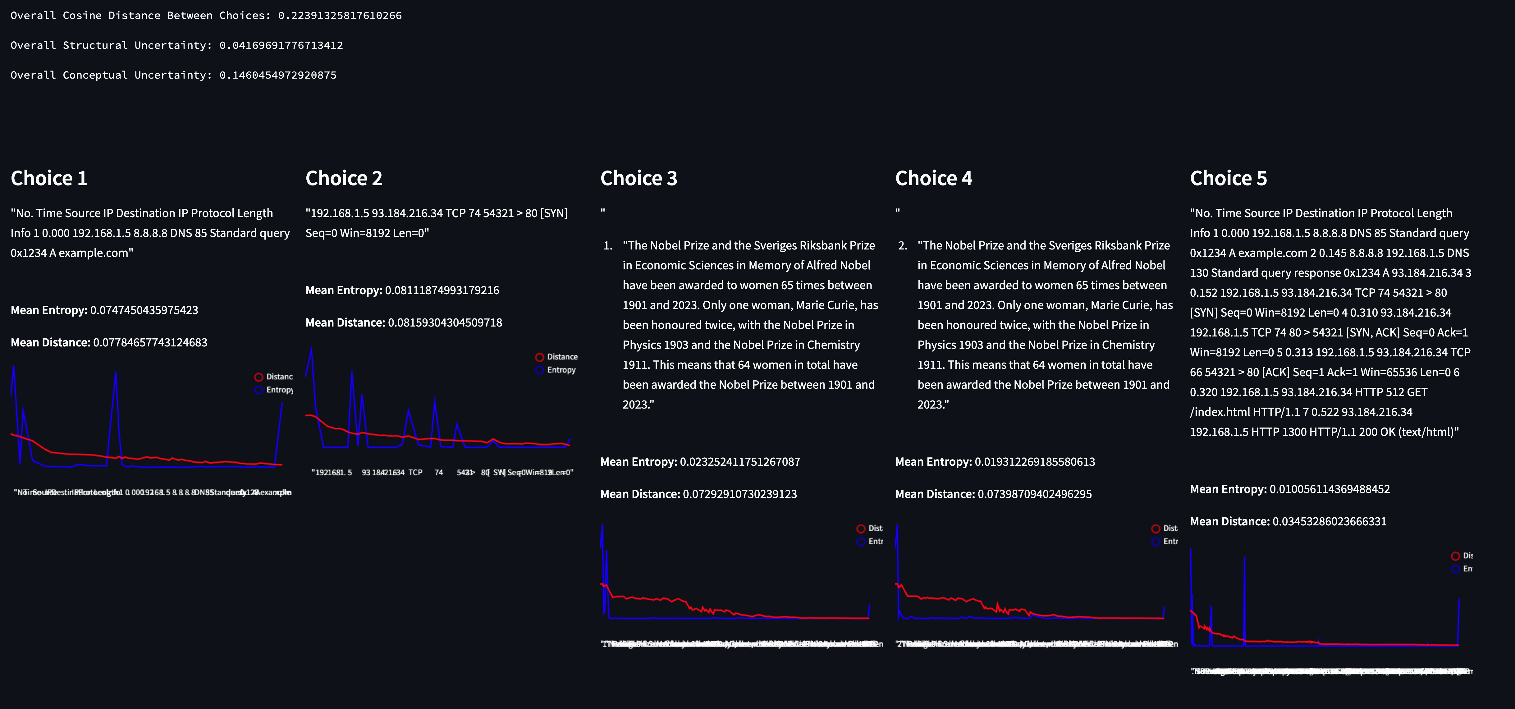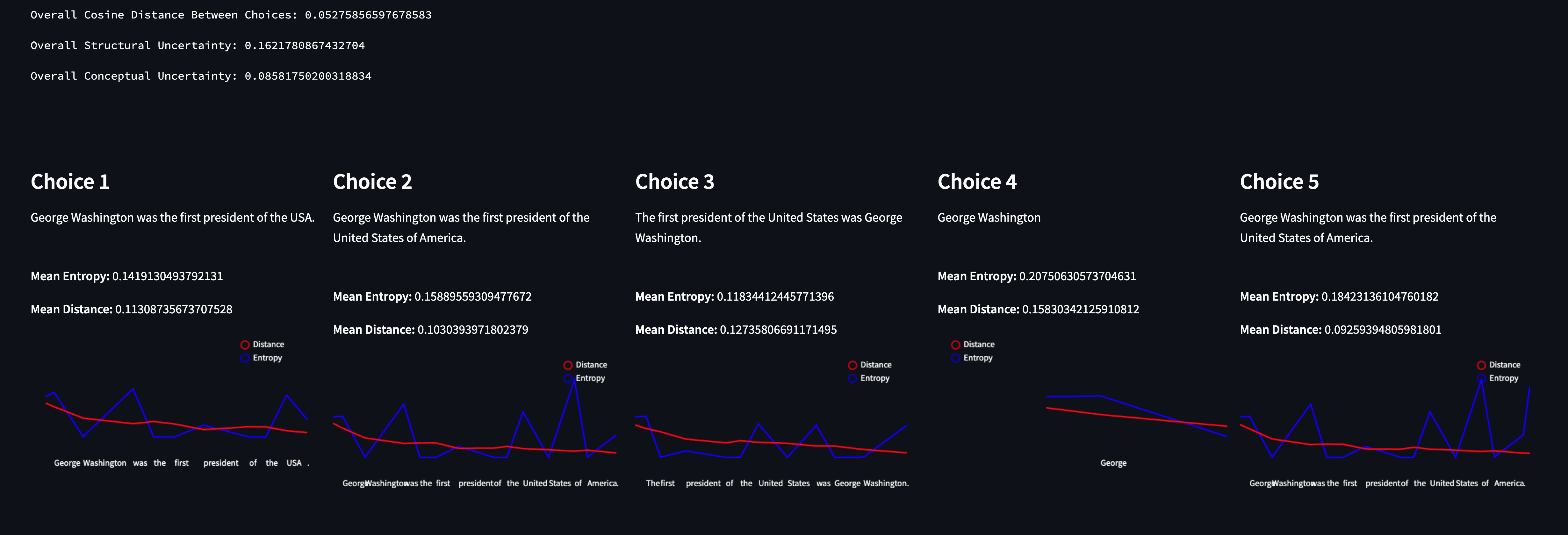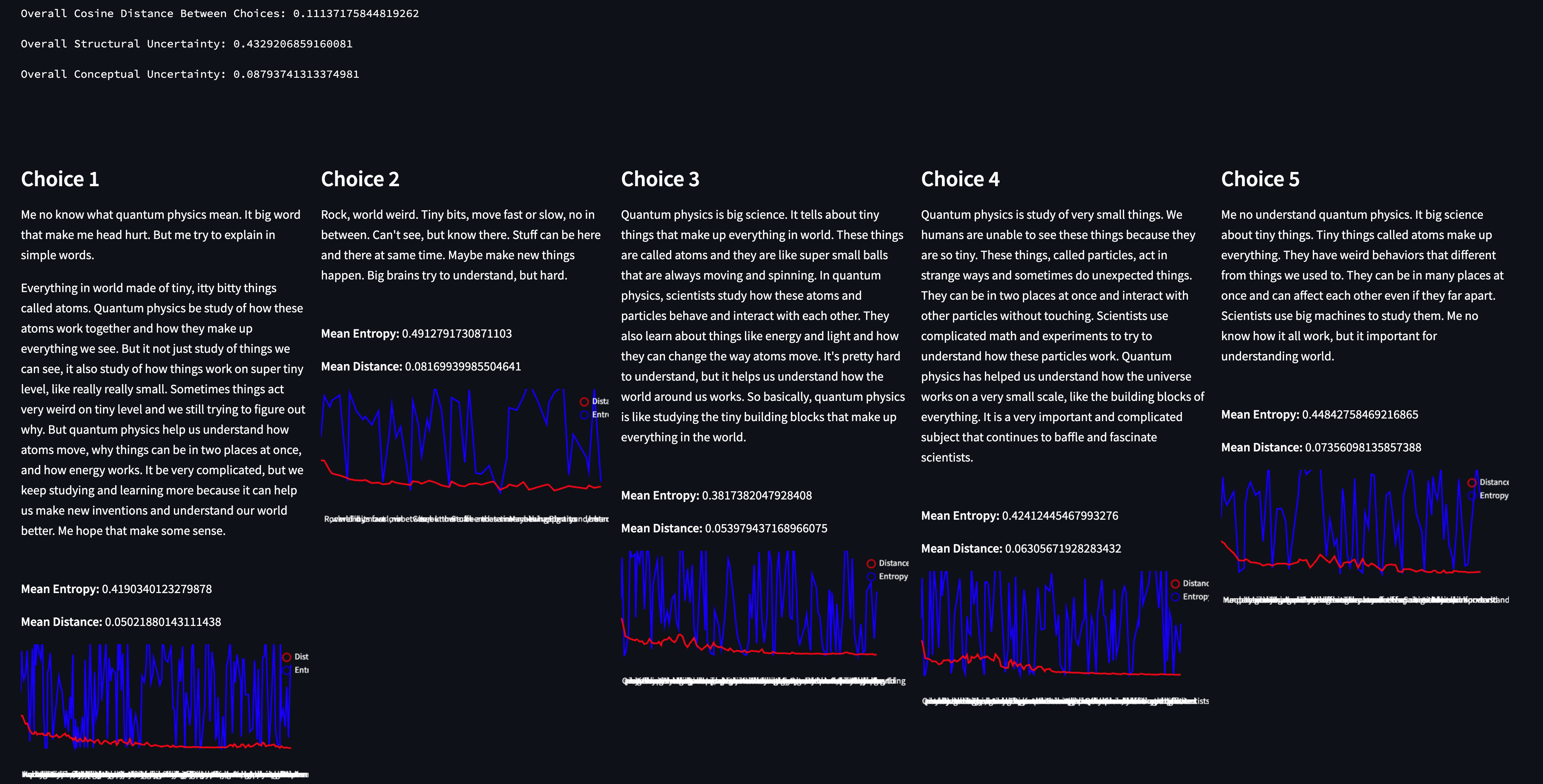 By quickly scanning the choices, we can see that the model was consistent in what it was trying to say - and the metrics reflect this. The Conceptual Uncertainty is extremely low, as is the cosine distance between each choice. However, structural uncertainty is curiously (relatively) high.