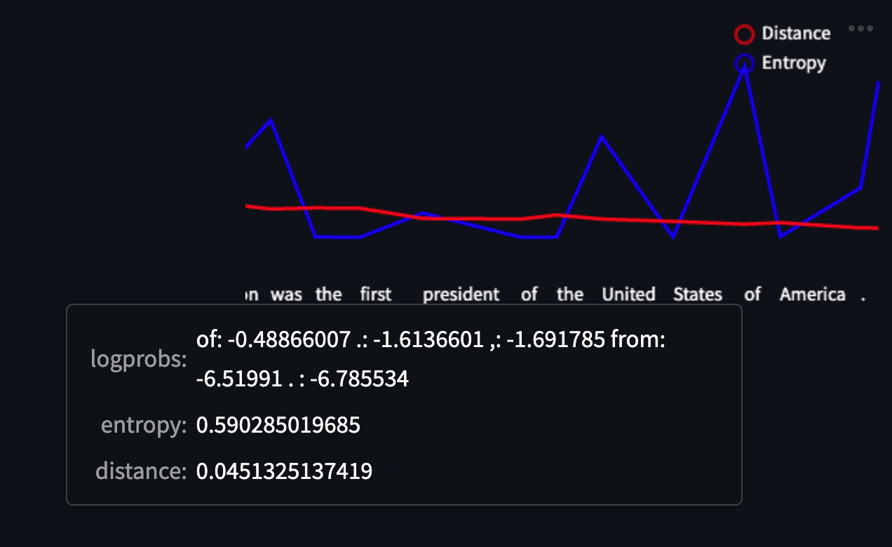 If we take a look at one of the responses and hover over a token (in this case “of”) we can see the other tokens that were sampled but ultimately weren’t chosen for the response. The first three tokens (”of”, “.”, and “,”) have similar logprobs, while “from” and “. “ (a period with a space in front of it) have much lower logprobs. The model “spread its probability” across the first three tokens, increasing the entropy at this particular point — however none of these tokens significantly change the essence of the response. The model was sure about what to say, just not necessarily how to say it.