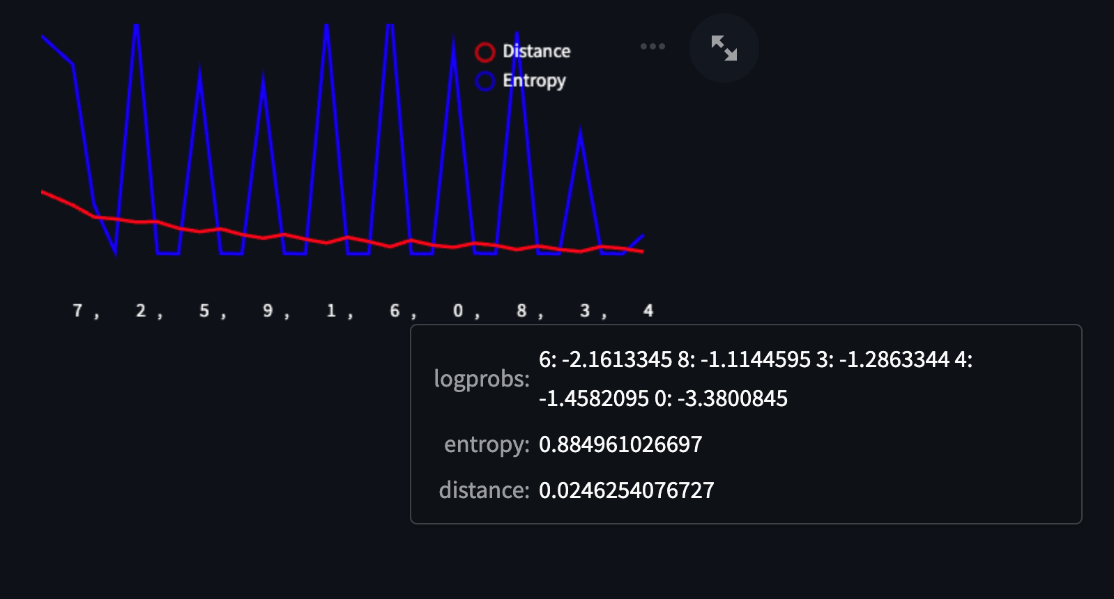 We found this prompt to be fascinating because of how intuitive the results were at first glance, but then surprising as we dug deeper! The chart shapes make intuitive sense — we’re asking the model to randomly sample numbers between 0 and 10, so we should see a spike of high entropy for each number because they should each have an equal likelihood of making it into the response for each token position. One thing that surprised us, however, is that none of the numbers repeated even though we never explicitly mentioned this in the prompt.